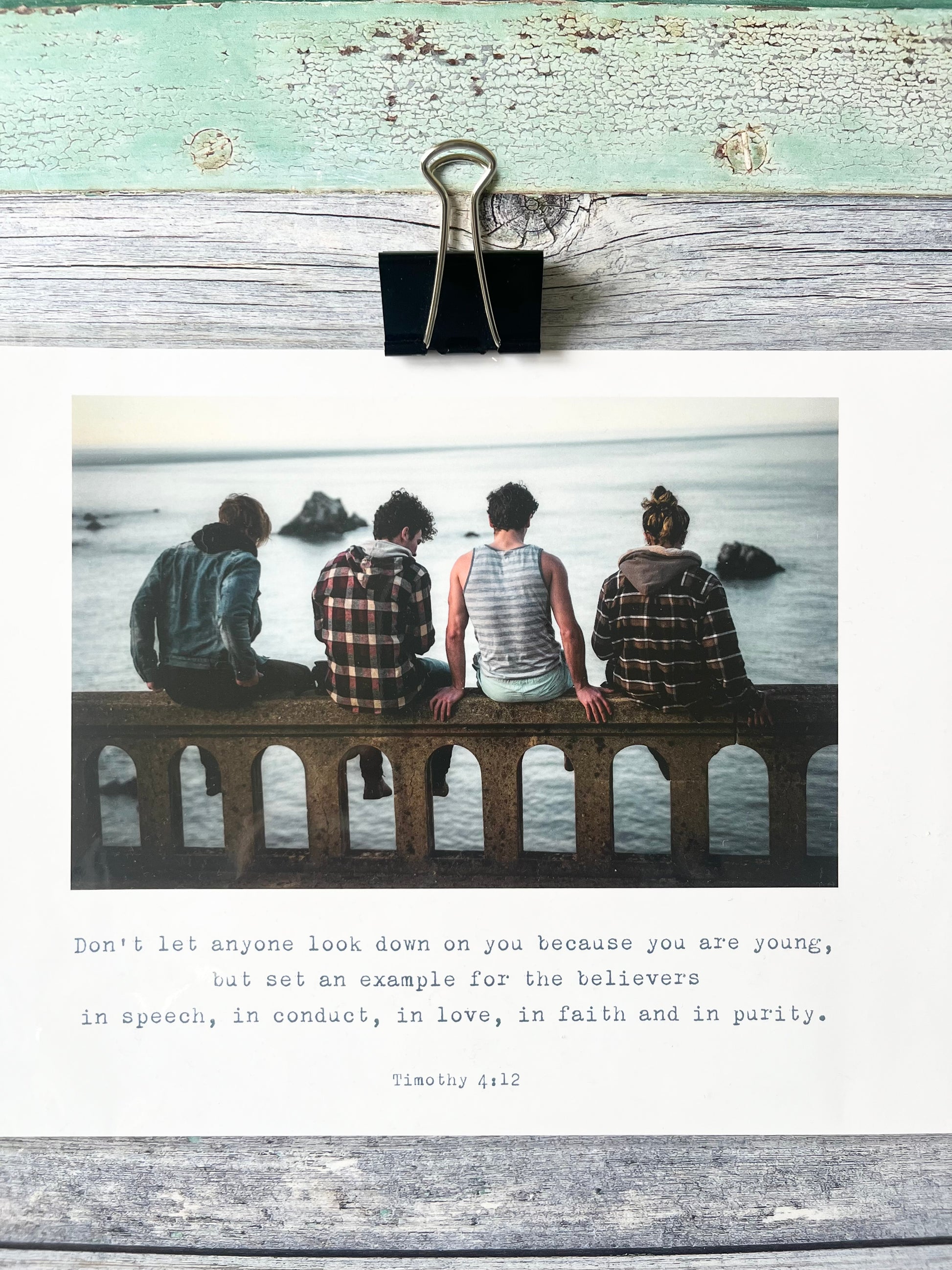 Print reads 'Don't let anyone look down on you because you are young, but set an example for the believers in speech, in conduct, in love, in faith and in purity.' Timothy 4:12